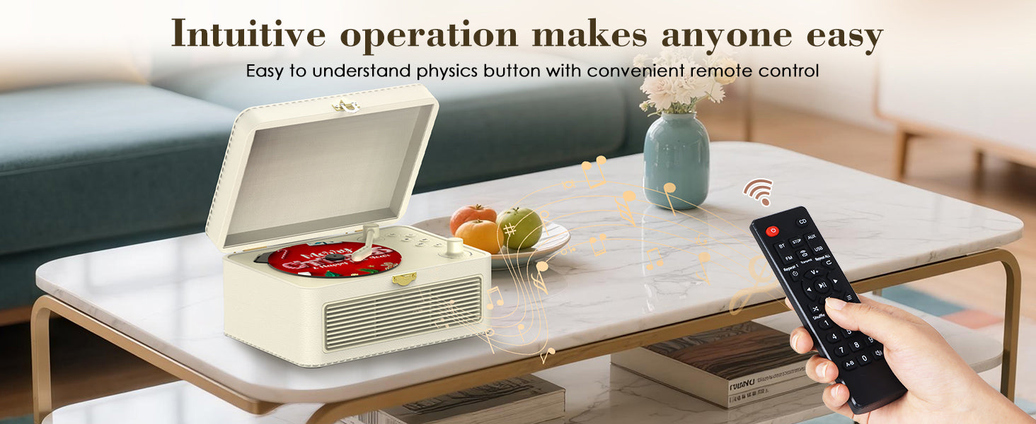 Featuring dual stereo speakers and a clean Hi-Fi sound quality, this portable cd player with bluetooth delivers rich, balanced audio without distortion. Simple buttons and voice prompts make operation easy for all ages, while the LED indicator and remote control offer effortless interaction. Music made simple — and beautiful.