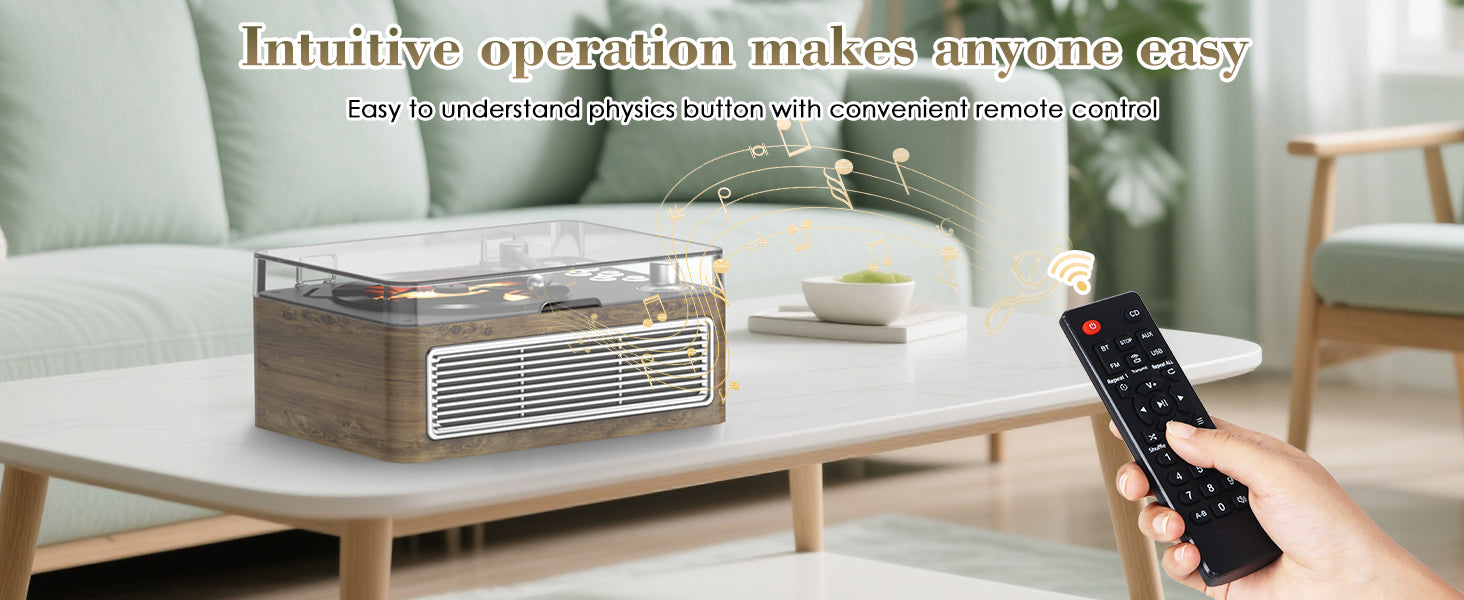 Featuring dual stereo speakers and a clean Hi-Fi sound quality, this portable cd player with bluetooth delivers rich, balanced audio without distortion. Simple buttons and voice prompts make operation easy for all ages, while the LED indicator and remote control offer effortless interaction. Music made simple — and beautiful.